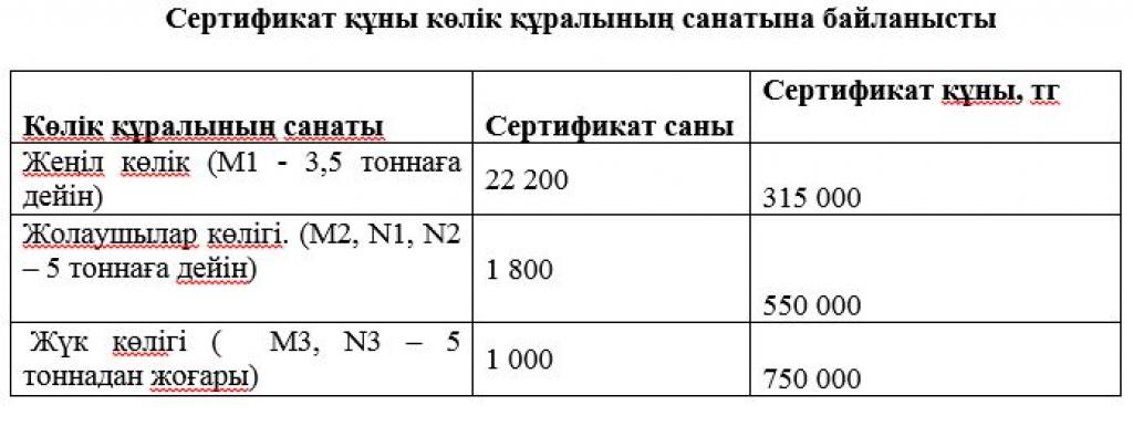 وكم وپەراتورىنا كولىكتەردى اقشاعا جانە سەرتيفيكات بەرۋ باعدارلاماسى بويىنشا قابىلداۋعا بيىل 50 مىڭ كۆوتا ءبولدى. سونىڭ 25 مىڭى جەڭىلدىك سەرتيفيكاتى باعدارلاماسىنا بولىنسە, قالعان 25 مىڭى اقشالاي وتەماقى باعدارلاماسىنا قاراستىرىلىپ وتىر. سونىمەن قاتار جۇك كولىكتەرىنە بەرىلەتىن سەرتيفيكات قۇنى بيىل ۇلعايتىلدى. بىلتىر ونىڭ قۇنى 450-650 مىڭ تەڭگە بولسا, وسى جىلدان باستاپ ونىڭ كولەمى 550-دەن 750 مىڭ تەڭگەگە دەيىن كوتەرىلدى. ال جەڭىل اۆتوكولىك سەرتيفيكاتىنىڭ قۇنى باياعى 315 تەڭگە قالپىندا قالدى.