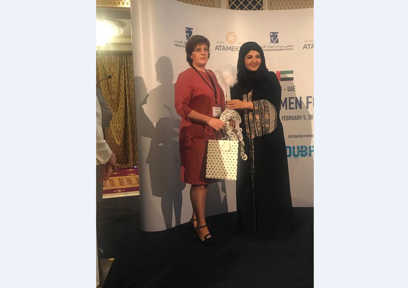 قوستانايلىق كاسىپكەر ايەل قاتىسقان فورۋمعا ارابتىڭ بيزنەس-حانىمى, ميلليونەر ريد ءال-دحاحەري دەمەۋشىلىك جاسادى. ەۆگەنيا وعان ءوزىنىڭ اتەلەسىندە تىگىلگەن ساۋكەلەنى سىيلادى. قوستانايلىق شەبەرلەردىڭ قولىنان شىققان قازاق ايەلىنىڭ ۇلتتىق باس كيىمىنىڭ ساندىلىگى فورۋمعا قاتىسۋشىلاردى تاڭ قالدىردى. ەۆگەنياعا اراب ايەلدەرىنىڭ تىككەن كيىمدەرى دە ۇنادى.