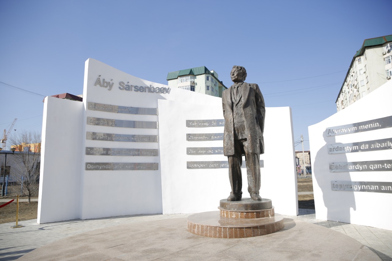 ەسكەرتكىشتە جازۋشىنىڭ تۇتاس تۇلعاسى مۇسىندەلگەن, بيىكتىگى – 3,5 مەتر. اۆتورى -قر سۋرەتشىلەر وداعىنىڭ مۇشەسى, مادەنيەت قايراتكەرى ايدارحان قالماحانوۆ.