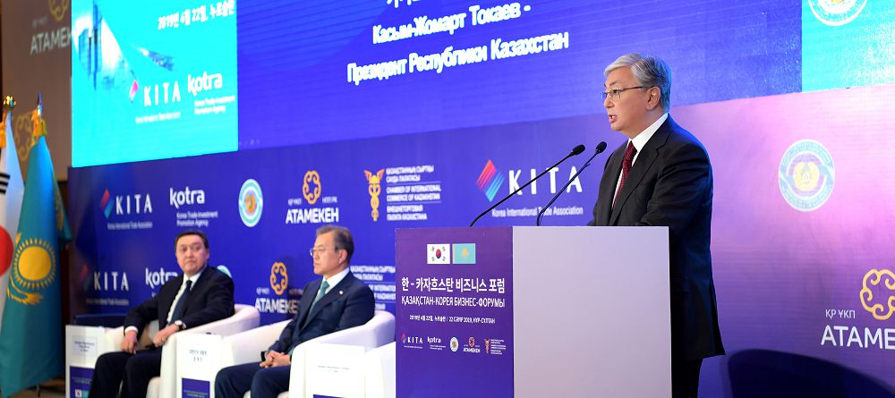 كەشە قازاقستان پرەزيدەنتى قاسىم-جومارت توقاەۆ پەن كورەيا رەسپۋبليكاسىنىڭ پرەزيدەنتى مۋن چجە ين قازاقستان-كورەيا بيزنەس-فورۋمىنا قاتىستى.