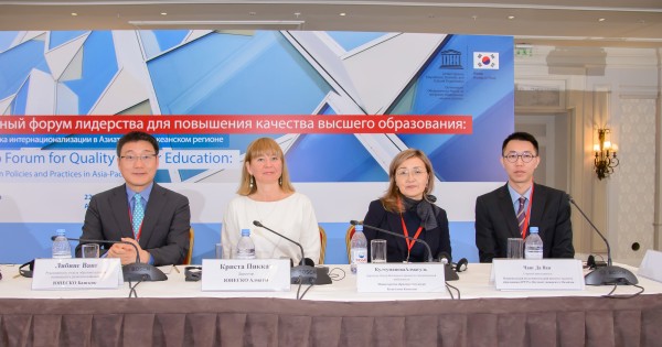 يۋنەسكو-نىڭ ءبىلىم بەرۋ جونىندەگى ازيا-تىنىق مۇحيتى وڭىرلىك بيۋروسى (يۋنەسكو بانگكوك) مەن يۋنەسكو-نىڭ الماتىداعى كلاستەرلىك بيۋروسى ازيا-تىنىق مۇحيتى وڭىرىندە ينتەرناتسيونالداندىرۋ ساياساتى مەن تاجىريبەسىنە ارنالعان ايماقتىق فورۋمدا ورتالىق ازيا ۋنيۆەرسيتەتتەرىنەن, سونداي-اق  ەۋروپا مەن ازيا-تىنىق مۇحيتى ايماعىنان كەلگەن ساراپشىلار جاھاندىق ۇدەرىس جاعدايىنداعى جوعارى ءبىلىمدى دامىتۋ تاقىرىبىن قوزعادى.