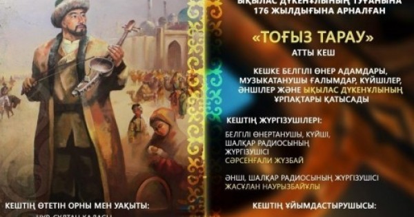ەرتەڭ ەلورداداعى ۇلتتىق اكادەميالىق كىتاپحانادا قازاقتىڭ اتاقتى كۇيشى-قوبىزشىسى, كومپوزيتور, قىلقوبىزدا ويناۋدىڭ اسقان شەبەرى ىقىلاس دۇكەن ۇلىنىڭ تۋعانىنا 176 جىل تولۋىنا وراي "توعىز تاراۋ" اتتى كەش وتەدى.