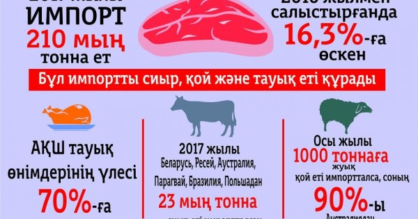 دەرەك بويىنشا ەلىمىزگە 2017 جىلى شەتەلدە وندىرىلگەن 210 مىڭ توننا ەت يمپورتتالعان. وكىنىشتىسى, بۇل سۇرانىس جىل سايىن ارتىپ كەلەدى. وسى 2017 جىلى سىرتتان كىرگەن ەت ءونىمى ارعى جىلمەن سالىستىرعاندا 16,3 پايىزعا وسكەن. شەكارا اسىپ كەلگەن ەت ونىمدەرىنىڭ ۇلەسىن سيىر, قوي جانە تاۋىق ەتى قۇرادى. قازاقستانعا «تاۋىق سيراعىن» ەكسپورتتاۋدا امەريكا توپ جارىپ تۇر. نارىقتاعى اقش تاۋىق ونىمدەرىنىڭ ۇلەسى 70 پايىزعا دەيىن جەتكەن. ال ساۋدا سورەلەرىندەگى سيىر ەتى مەن ونىڭ ونىمدەرىن بەلارۋس, رەسەي, اۋستريا, پاراگۆاي, برازيليا, پولشا مەملەكەتىندە جاسالعان تاۋار قۇرادى. 2017 جىلى بۇل ەلدەردەن 23 مىڭ توننا سيىر ەتى قازاقستانعا جەتكىزىلگەن. وسى جىلى 1 000 تونناعا جۋىق قوي ەتى قازاقتىڭ قازانىندا قايناعان بولسا, ونىڭ 90 پايىزعا جۋىعى اۋستريادان كەلگەن يمپورت ەكەن.