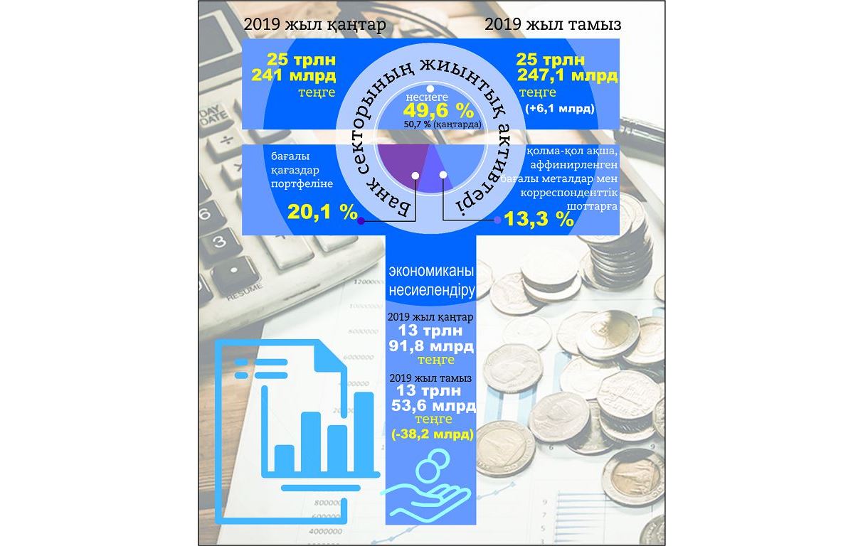 جىل باسىندا بانك سەكتورىنىڭ جيىنتىق اكتيۆتەرى 25 ترلن 241 ملرد تەڭگە بولعان ەدى. ۇلتتىق بانكتىڭ مالىمەتىنشە, 1 تامىزداعى كورسەتكىش بويىنشا بانك سەكتورىنىڭ جالپى اكتيۆى بار بولعانى 6,1 ملرد تەڭگەگە ارتىپ, 25 ترلن 247,1 ملرد تەڭگەگە جەتتى.