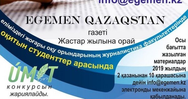 وسى باعىتتى جازىلعان ماتەريالدار 2019 جىلدىڭ 2 قازانىنان 10 قاراشاسىنا دەيىن info@egemen.kz ەلەكتروندى مەكەنجايىنا قابىلدانادى.