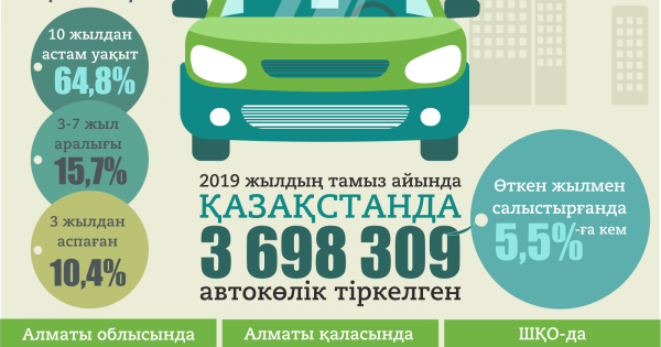 نازار اۋداراتىن دۇنيە, ەلىمىزدەگى اۆتوماشينالاردىڭ شىعارىلعان مەرزىمى كوبىنەسە 10 جىلدان استام ۋاقىتتى قۇرايدى. بۇل – 64,8%-عا تەڭ. 3 جىل مەن 7 جىل ارالىعىندا شىققان ماشينالار سانى مۇلدەم از, تىركەلگەن كولىكتەردىڭ جالپى سانىنا شاققاندا بار بولعانى – 15,7%-دى قۇرايدى. ال شىعارىلعان جىلى 3 جىلدان اسپايتىن كولىكتەر سانى ەلىمىزدە ءتىپتى از – 10,4%.
