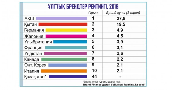 قازاقستان بيىل الەمدەگى ەڭ قىمبات ۇلتتىق برەندتەردىڭ تىزىمىندە بىلتىرعى 51-ورىننان 7 ساتىعا كوتەرىلىپ, 44-ورىنعا تۇراقتادى. بۇعان دەيىن ءبىزدىڭ ەل بۇل رەيتينگتە مۇنشالىقتى كوتەرىلىپ كورمەگەن. پورتۋگاليا, رۋمىنيا, ۆەنگريا, سلوۆاكيا سىندى ەۋروپانىڭ بىرقاتار ەلى بىزدەن تومەنگى ساتىعا ورنالاسىپتى. ۇلتتىق برەند قۇنىنىڭ كوتەرىلۋ قارقىنى بويىنشا دا ەلىمىز 8-ورىندا تۇر.