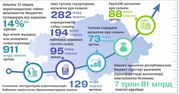 – ىشكى تۇتىنۋ تاۋارلارىنا قوسىلعان قۇن سالىعى 282 ملرد تەڭگەگە, كورپوراتيۆتىك تابىس سالىعى 194 ملرد تەڭگەگە, ەڭبەكاقى قورىنان تۇسەتىن سالىق 95 ملرد تەڭگەگە وسكەنى بايقالادى. سونداي-اق كەدەندىك تولەمدەر دە ءوستى. ەۋرازەق قوسىلعان قۇن سالىعى 88 ملرد تەڭگەگە, ءۇشىنشى ەلدەردەن قوسىلعان قۇن سالىعى 73 ملرد تەڭگەگە ارتتى. بيىلعا ارنالعان رەسپۋبليكالىق بيۋدجەت كىرىستەرى كولەمىنىڭ (ترانسفەرتتەردى قوسپاعاندا) ناقتىلانعان بولجامى 7 ترلن 81 ملرد تەڭگەنى قۇرايدى, – دەدى ءا.سمايىلوۆ. ونىڭ ايتۋىنشا, سالىقتىق تەكسەرۋلەردىڭ قورىتىندىلارى بويىنشا انىقتالعان بۇزۋشىلىقتاردىڭ سوماسى 129 ملرد تەڭگەگە جەتكەن.