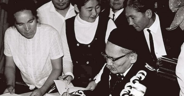 سۋرەتتە: ب.مومىش ۇلى جۋالى وقىرماندارىنىڭ ورتاسىندا. ارتىندا تۇرعان ە.داۋىلباي ۇلى.
