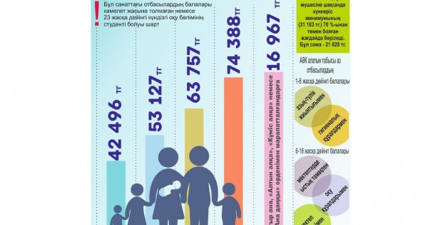 اتاپ ايتقاندا, ءتورت بالاعا – 42 496 تەڭگە, بەس بالاعا – 53 127 تەڭگە, التى بالاعا – 63 757 تەڭگە, جەتى جانە ودان دا كوپ بالاسى بار وتباسىلارعا 74 388 تەڭگە جاردەماقى تاعايىندالدى. سونداي-اق باتىر انا, «التىن القا», «كۇمىس القا» القالارىمەن نەمەسە «انا داڭقى» وردەنىمەن ماراپاتتالعاندارعا اي سايىن 16 967 تەڭگە تولەنەدى.