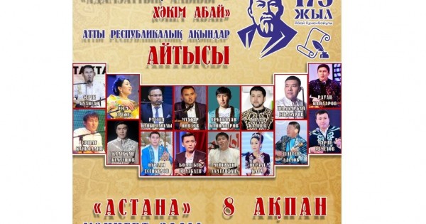 نۇر-سۇلتان قالاسىندا 8 اقپان كۇنى ۇلى ابايدىڭ 175 جىلىعىنا وراي «ادامزاتتىڭ الىبى – حاكىم اباي» اتتى رەسپۋبليكالىق اقىندار ايتىسى وتەدى.