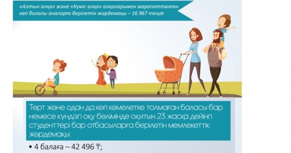 ەستەرىڭىزگە سالايىق, 2020جىلدان باستاپ وتباسىندا بىرگە تۇراتىن كامەلەتكە تولماعان ءتورت جانە ودان دا كوپ بالالارى, ونىڭ ىشىندە كامەلەت جاسىنا تولعاننان كەيىن ءبىلىم بەرۋ ۇيىمدارىن تامامداعانعا دەيىن (23 جاسقا دەيىن) ورتا, تەحنيكالىق جانە كاسىپتىك, ورتا بىلىمنەن كەيىنگى, جوعارى جانە جوعارى وقۋ ورنىنان كەيىنگى ءبىلىم بەرۋ ۇيىمدارىندا وقيتىن بالالارى بار وتباسىنا اي سايىن تاعايىندالاتىن مەملەكەتتىك جاردەماقى كولەمى: 4 بالاسى بارلارعا – 42 496 تگ, 5 بالاعا – 53 127 تگ, 6 بالاعا – 63 757 تگ, 7 جانە ودان كوپ بالاعا – 74 388 تگ.