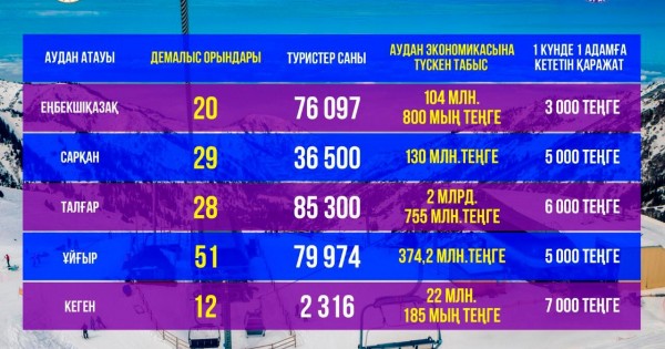 - تۋريزم – تابىس كوزى عانا ەمەس, قازاق مادەنيەتىن الەمگە تانىتۋدىڭ دا ءبىر جولى. ءبىز ءوز تاراپىمىزدان تۋريستىك ايماقتاردىڭ ينفراقۇرلىمىن جاساقتاۋعا كوڭىل ءبولىپ وتىرمىز. الاكول جاعالاۋى بۇرىن قانداي ەدى, قازىر قانداي؟ دەمالۋشىلار سانى جىل سايىن كوبەيۋدە. 2019 جىلى تۋريستەر سانى 2 ملن ادامعا جەتتى. جالپى 2025 جىلى الماتى وڭىرىنە كەلەتىن بولجامدى تۋريستەر لەگى 4 ملن ادامعا جەتەدى, ونىڭ ىشىندە الماتى وبلىسىنىڭ نىساندارىنا عانا 3,5 ميلليون ادام كەلەدى دەپ كۇتىلۋدە. مۇنان بولەك الماتى ءوڭىرىنىڭ تاۋ كلاستەرىن دامىتۋعا اسا ءمان بەرىلۋدە. ينۆەستيتسياسىنىڭ جالپى كولەمى 111 ملرد تەڭگەنى قۇرايتىن تۇرگەن شاتقالىنداعى «دولينا-3» تاۋ-شاڭعى كۋرورتى جانە «اپورت اق-تاس» كوپسالالى تاۋ-شاڭعى كەشەنى جوبالارىن ىسكە اسىرۋ جوسپارلانعان. تاۋ كلاستەرى اۋماعىندا جىلىنا 1,5 ملن تۋريستكە قىزمەت كورسەتۋ جوسپارى تۇر, - دەيدى الماتى وبلىسىنىڭ اكىمى اماندىق باتالوۆ.