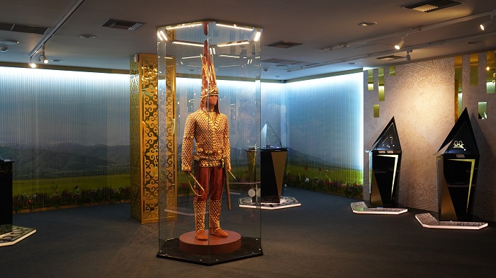 ءۇندىستان ۇلتتىق مۋزەيىنە ۇسىنىلعان كورمەدەن كيىمى التىن جاپسىرمالى جانە جەبە, قار بارىسى, ارقار, جىلقى جانە قۇس تۇرىندەگى التىن تىلىمشەلەر اشەكەيلەپ تۇرعان كونۋس ءپىشىندى ەرەكشە باس كيىمدى التىن ادامنىڭ رەكونسترۋكتسياسىن جانە وسى جاس اق سۇيەك ساق جاۋىنگەرىمەن (ارحەولوگتاردىڭ پىكىرلەرى بويىنشا 17-18 جاستار شاماسىندا) بىرگە جەرلەنگەن ەرتە تەمىر عاسىرىنىڭ (ب.د.د V-IV عع.) ارحەولوگيالىق ولجالارىنىڭ كوللەكتسياسىن تاماشالاۋعا بولادى.