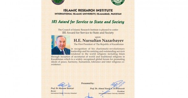 قازاقستاننىڭ تۇڭعىش پرەزيدەنتىنىڭ حالىقارالىق قاۋىمداستىققا قوسقان وراسان زور ۇلەسىن مويىنداي وتىرىپ, يسلاماباد حالىقارالىق يسلام ۋنيۆەرسيتەتىنىڭ يسلام زەرتتەۋ ينستيتۋتى كەڭەسىنىڭ باستاماسىمەن ەلباسىنىڭ جوعارى ماراپاتىن پاكىستان ۇلتتىق اسسامبلەياسىنىڭ سپيكەرى اساد كايزەر ۇسىندى.