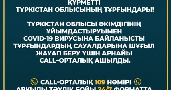 وسىعان بايلانىستى تۇركىستان وبلىسى اكىمدىگىنىڭ ۇيىمداستىرۋمەن تۇرعىنداردىڭ ساۋالدارىڭىزعا شۇعىل جاۋاپ بەرۋ ءۇشىن ارنايى Call–ورتالىق اشىلۋدا. ورتالىق توتەنشە جاعدايدا تۋىنداعان ساۋالدارعا جاۋاپ بەرەتىن بولادى.