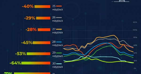 «سەرگەك» ترافيگىنىڭ يندەكسى 2020 جىلدىڭ 12 ناۋرىزىنان باستاپ ەلوردا جولدارىندا كولىك سانى 71%-عا ازايعانىن كورسەتەدى.