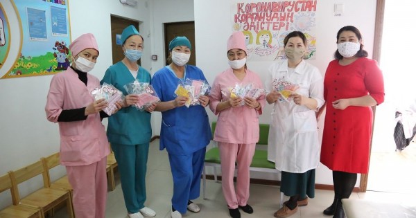 مەكتەپ اكىمشىلىگىنىڭ ۇسىنىسىمەن ونەر ءپانىنىڭ مۇعالىمى الماگۇل جۇماەۆا بالاباقشالارداعى قىزمەتكەرلەرگە ارناپ 60 بەتپەردە تىكتى. قورعانىس قۇرالدارى ءار بالاباقشا ماماندارىنا 20 دانادان تاراتىلدى. بالاباقشا قىزمەتكەرلەرى مۇنداي قايىرىمدىلىققا ءماز بولىپ, مەكتەپ ۇجىمىنا العىس ءبىلدىردى.