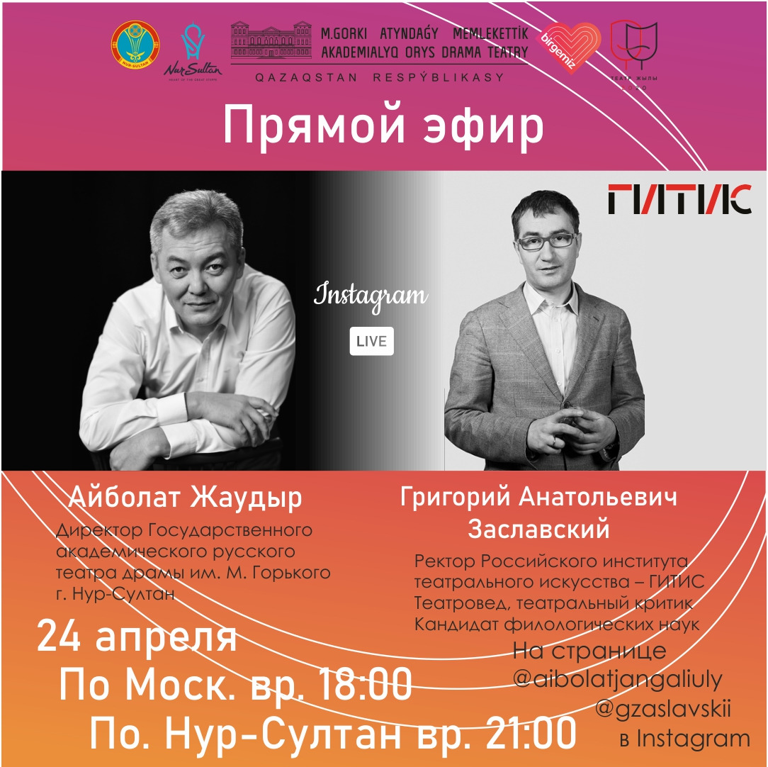 ترانسلياتسيا م. گوركي اتىنداعى مەملەكەتتىك اكادەميالىق ورىس دراما تەاترىنىڭ Instagram-داعى @aibolatjangaliuly, @gzaslavskii پاراقشالارىندا بولادى.