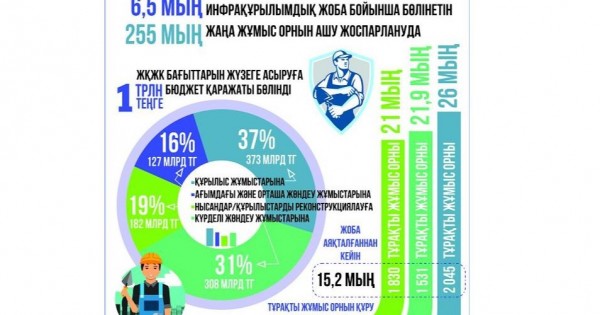 ەڭ كوپ جۇمىس ورنى الماتى قالاسىندا اشىلادى دەپ جوسپارلانعان, مەگاپوليستە 26 مىڭ ادام جۇمىسپەن قامتىلۋعا ءتيىس. ودان كەيىنگى ورىندارداعى تۇركىستان وبلىسىندا – 21,9 مىڭ, الماتى وبلىسىندا 21 مىڭ ادامعا جۇمىس بەرىلەدى.