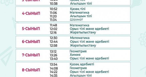 بەينەساباقتار قازاق تىلىندە سەيسەنبى جانە سارسەنبى كۇندەرى ساعات 09:00-دەن باستاپ 17:00-گە دەيىن 1-11 سىنىپ وقۋ پəندەرى بويىنشا «Balapan» تەلەارناسىنان كورسەتىلەدى. تەلەارنانى www.balapan.tv رەسمي سايتى مەن «Qazaqstan.tv» ءموبيلدى قوسىمشاسىنان ونلاين كورۋ مۇمكىندىگى بار.