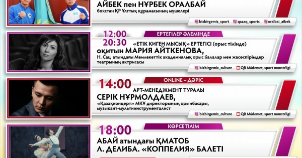 18:00-دە قازاقستاننىڭ ماڭداي الدى بالەت ۇجىمدارى وزىق قويىلىمدارىن مادەنيەت جانە سپورت مينيسترلىگىنىڭ You Tube ارناسى مەن bizbirgemiz_culture ينستاگرام پاراقشاسىندا تارتۋ ەتەدى.