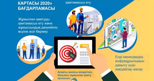 «جۇمىسپەن قامتۋ 2020 جول كارتاسى» باعدارلاماسى حالىقتى جۇمىسپەن قامتۋ ماسەلەلەرىن جەدەل شەشۋ ماقساتىندا ازىرلەندى جانە قوسىمشا جۇمىس ورىندارىن قۇرۋعا, الەۋمەتتىك, ينجەنەرلىك-كولىكتىك ينفراقۇرىلىمدى جانە تۇرعىن ءۇي-كوممۋنالدىق شارۋاشىلىقتى دامىتۋ, ەلدى مەكەندەردى اباتتاندىرۋ بويىنشا ينفراقۇرىلىمدىق جوبالاردى ىسكە اسىرۋ ەسەبىنەن جۇمىسسىز ازاماتتار سانىنىڭ وسۋىنە جول بەرمەۋگە باعىتتالعان شارالار كەشەنىن انىقتايدى.