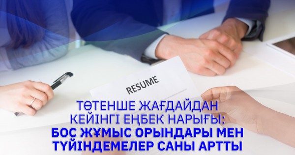 «ەڭبەك رەسۋرستارىن دامىتۋ ورتالىعى» اق مالىمەتتەرى بويىنشا بوس جۇمىس ورىندارىنىڭ سانىنىڭ كۇرت ازايۋى ناۋرىز ايىندا بايقالعان — 68,9 مىڭنان 34,2 مىڭعا دەيىن تومەندەگەن. جۇمىس ىزدەۋشىلەردەن كەلىپ تۇسكەن تۇيىندەمەلەر سانى دا 29 مىڭنان 20,1 مىڭعا دەيىن ازايعان. الايدا كارانتين شارالارىن كەزەڭ-كەزەڭمەن جەڭىلدەتۋ جانە كاسىپورىنداردىڭ جۇمىسقا كىرىسۋى نارىقتى جانداندىردى, بۇگىندە ەلەكتروندى ەڭبەك بيرجاسىنىڭ بازاسىندا 75,7 مىڭ تۇيىندەمە ورنالاستىرىلعان.