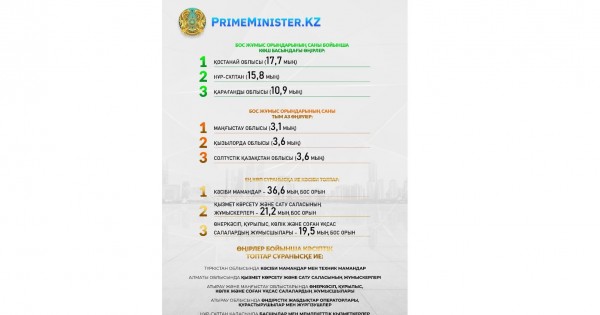 باسشىلار مەن مەملەكەتتىك قىزمەتشىلەرگە ەڭ ۇلكەن سۇرانىس نۇر-سۇلتاندا — 468 بوس جۇمىس ورنى, قاراعاندى وبلىسىندا — 343 بوس جۇمىس ورنى, شىعىس قازاقستان وبلىسىندا — 333 بوس جۇمىس ورنى, قوستاناي وبلىسىندا — 325 بوس جۇمىس ورنى ورنالاستىرىلعان.
