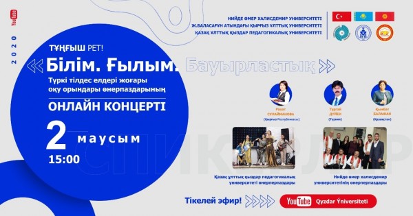 ونلاين فورماتتا ۇيىمداستىرىلاتىن شاراعا قازاق ۇلتتىق قىزدار پەداگوگيكالىق ۋنيۆەرسيتەتى, تۇركيانىڭ نيگدە ومەر حاليسدەمير ۋنيۆەرسيتەتى جانە قىرعىز رەسپۋبليكاسىنىڭ ءجۇسىپ بالاساعۇن اتىنداعى قىرعىز مەملەكەتتىك ۋنيۆەرسيتەتىنىڭ ونەر ۇجىمدارى قاتىسپاق.