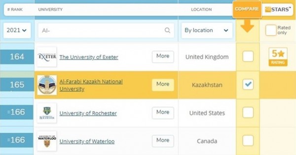 جاھاندىق ەڭ تانىمال جانە بەدەلدى Quacquarelli Symonds (QS) رەيتينگتىك اگەنتتىگى الەمنىڭ جوعارى وقۋ ورىندارى بويىنشا زەرتتەۋدىڭ بيىلعى جىلعى ناتيجەلەرىن جاريالادى. QS اناليتيكالىق ەسەبىندە اتاپ وتىلگەندەي, ءال-فارابي اتىنداعى قازۇۋ 42 ورىنعا ىلگەرىلەپ, جاھاندىق رەيتينگتە 165-ورىندى يەلەندى جانە "الەمنىڭ ەڭ ۇزدىك 200 ۋنيۆەرسيتەتتەرىنىڭ قاتارىنا ەنگەن العاشقى قازاقستاندىق جوعارى وقۋ ورنى بولدى". پوستكەڭەستىك ەلدەردەن تەك ەكى ۋنيۆەرسيتەت قانا وسى توپقا ەنىپ وتىر – م.ۆ. لومونوسوۆ اتىنداعى ماسكەۋ مەملەكەتتىك ۋنيۆەرسيتەتى جانە ءال-فارابي اتىنداعى قازاق ۇلتتىق ۋنيۆەرسيتەتى.