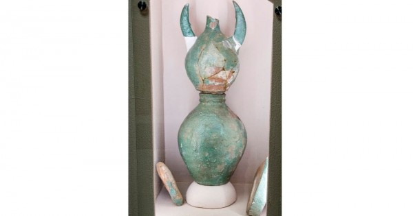«قۇببانىڭ سىرتىنا كوگىلدىر گلازۋر جىلتىراق جالاتىلعان. كۇمبەزدىڭ توبەسىندەگى ويىققا ءبىر ءىزدى سىزىق ارقىلى ورتاسىنا اعاش وزەكشە كيگىزىلىپ, وزەكشەنى مىقتى ۇستاپ تۇرۋى ءۇشىن ىشىنە «الەباستر» ەرىتىندىسى تولتىرىلعان. وكىنىشكە قاراي, قۇببانىڭ ەڭ جوعارعى بولىگى جوعالعان. ال ەڭ تومەنگى بولىگى كۇمبەزدىڭ وزەكشە وتەتىن ويىعىن جاباتىن توڭكەرىلگەن توستاعان تۇرىندە بولعان. ونىڭ ۇستىنە ءتۇبى جوق ء«مۇيىزدى» ىدىسقا ۇقسايتىن, تومەنگى تار جانە جىڭىشكە تارتىلعان مويىنى بار دوڭگەلەك دەنەلى ىدىس كيىلەدى. وعان كيىلەتىن ۇستىڭگى بولشەگىندە ەكى جاعىنان ء«مۇيىزدىڭ» جوعارى يىلگەن ءىزىنىڭ قالدىعى ساقتالعان. ال ەڭ جوعارعى جارتى اي ەكى ءمۇيىز بەينەسىندە اشەكەيلەنگەن», دەپ سۋرەتتەيدى جادىگەردىڭ سيپاتىن مۋزەي ديرەكتورى باقتيار قوجاحمەتوۆ.