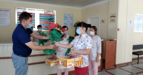 قۇتتىقتاۋ بارىسىندا شىمكەنت دەنساۋلىق ساقتاۋ باسقارماسى باسشىسىنىڭ ورىنباسارى ەرنار مىرزاقۇلوۆ مەديتسينا قىزمەتكەرلەرىنە سىيلىق تاپسىرىپ, جۇمىستارىنا ساتتىلىك تىلەدى.