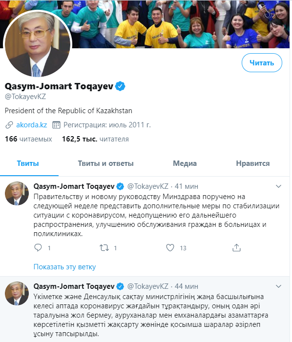 "ۇكىمەتكە جانە دەنساۋلىق ساقتاۋ مينيسترلىگىنىڭ جاڭا باسشىلىعىنا كەلەسى اپتادا كوروناۆيرۋس جاعدايىن تۇراقتاندىرۋ, ونىڭ ودان ءارى تارالۋىنا جول بەرمەۋ, اۋرۋحانالار مەن ەمحانالارداعى ازاماتتارعا كورسەتىلەتىن قىزمەتتى جاقسارتۋ جونىندە قوسىمشا شارالار ازىرلەپ ۇسىنۋ تاپسىرىلدى, دەيدى ەل پرەزيدەنتى ق.توقاەۆ.