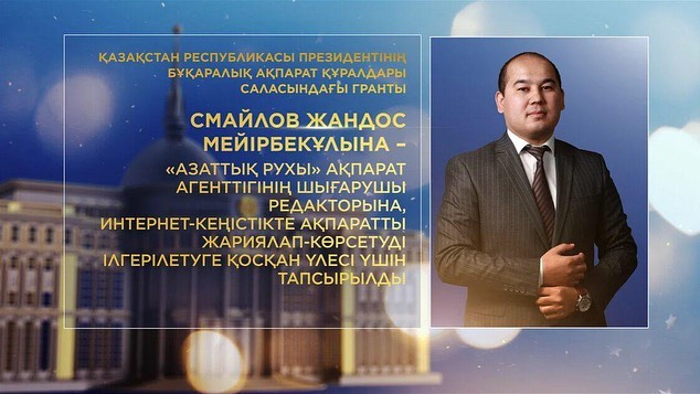 سمايلوۆ جاندوس مەيىربەك ۇلىنا – "ازاتتىق رۋحى" اقپارات اگەنتتىگىنىڭ شىعارۋشى رەداكتورىنا, ينتەرنەت-كەڭىستىكتە اقپاراتتى جاريالاپ-كورسەتۋدى ىلگەرىلەتۋگە قوسقان ۇلەسى ءۇشىن تاپسىرىلسىن;