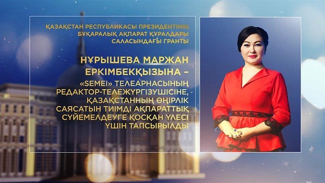 نۇرىشەۆا مارجان ەركىمبەكقىزىنا – "Semei" تەلەارناسىنىڭ رەداكتور-تەلەجۇرگىزۋشىسىنە, قازاقستاننىڭ وڭىرلىك ساياساتىن ءتيىمدى اقپاراتتىق سۇيەمەلدەۋگە قوسقان ۇلەسى ءۇشىن;