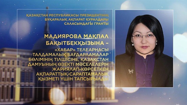 مادياروۆا ماقپال باقىتبەكقىزىنا – "حابار" تەلەارناسى تالدامالىق باعدارلامالار ءبولىمىنىڭ تىلشىسىنە, قازاقستان دامۋىنىڭ وزەكتى ماسەلەلەرىن جاريالاپ-كورسەتكەن اقپاراتتىق-تالدامالىق قىزمەتى ءۇشىن;
