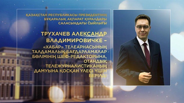 ترۋحاچەۆ الەكساندر ۆلاديميروۆيچكە – "حابار" تەلەارناسىنىڭ تالدامالىق باعدارلامالار ءبولىمىنىڭ شەف-رەداكتورىنا, وتاندىق تەلەجۋرناليستيكانىڭ دامۋىنا قوسقان ۇلەسى ءۇشىن بەرىلسىن;