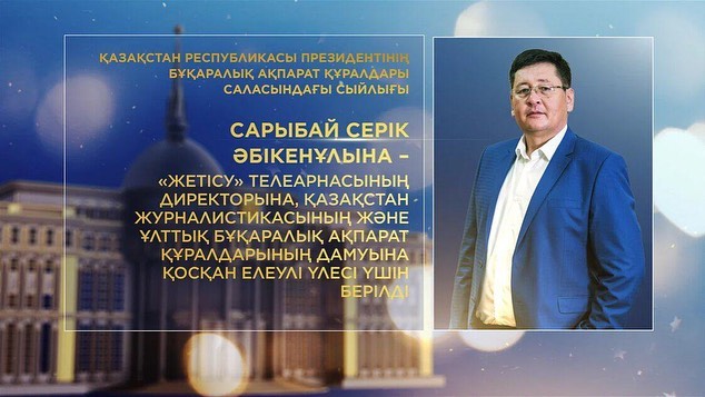 سارىباي سەرىك ابىكەن ۇلىنا – "جەتىسۋ" تەلەارناسىنىڭ ديرەكتورىنا, قازاقستان جۋرناليستيكاسىنىڭ جانە ۇلتتىق بۇقارالىق اقپارات قۇرالدارىنىڭ دامۋىنا قوسقان ەلەۋلى ۇلەسى ءۇشىن;