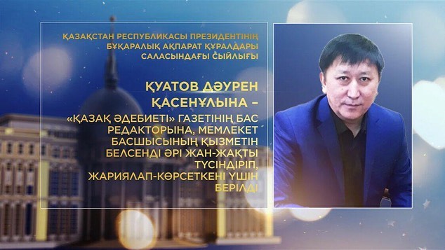 قۋاتوۆ داۋرەن قاسەن ۇلىنا – "قازاق ادەبيەتى" گازەتىنىڭ باس رەداكتورىنا, مەملەكەت باسشىسىنىڭ قىزمەتىن بەلسەندى ءارى جان-جاقتى ءتۇسىندىرىپ, جاريالاپ-كورسەتكەنى ءۇشىن;