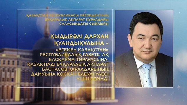 قىدىرالى دارحان قۋاندىق ۇلىنا – "ەگەمەن قازاقستان" رەسپۋبليكالىق گازەتى" اق باسقارما توراعاسىنا, قازاقتىلدى بۇقارالىق اقپارات ءباسپاسوز قۇرالدارىنىڭ دامۋىنا قوسقان ەلەۋلى ۇلەسى ءۇشىن;