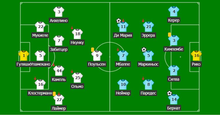 پسج: قاقپاشى – ريكو; قورعاۋشىلار – كەرەر, كيمپەمبە, سيلۆا, بەرنات; جارتىلاي قورعاۋشىلار – ەررەرا (ۆەرراتتي), ماركينوس, پارەدەس (دراكسلەر); شابۋىلشىلار – دي ماريا (سارابيا), مباپپە (شۋپو-موتين), نەيمار.