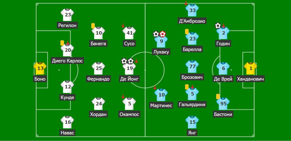 «ينتەر»: حاندانوۆيچ, گودين (كاندرەۆا, 90), دە ۆرەي, باستوني, د ' امبروزيو (الەكسيس سانچەس, 78), بارەللا, بروزوۆيچ, گالارديني (ەريكسەن, 78), يانگ, لۋكاكۋ, لاۋتارو مارتينەس (موزەس, 78).