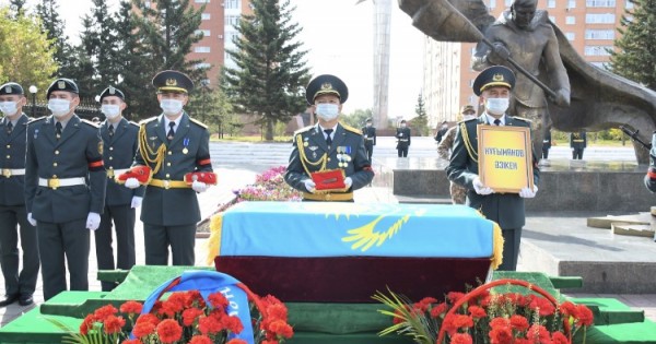 وبلىس اكىمى ەرمەك مارجىقپاەۆ, رەسەي ەلشىلىگىنىڭ وكىلدەرى مەن قالا جۇرتشىلىعى داڭق مەموريالىنا گۇل شوقتارىن قويىپ, اسكەري قۇرمەتتى ەسكورد جاۋىنگەر سۇيەگى سالىنعان تابىتتى الىپ شىقتى.