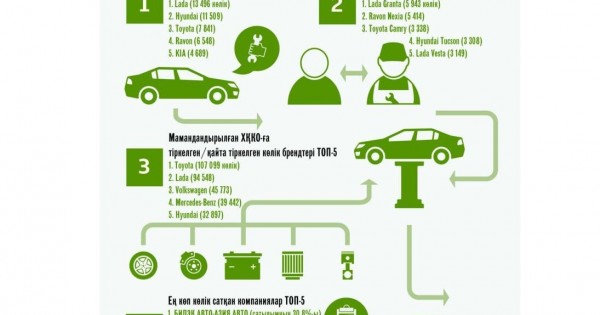 ەسەپتى كەزەڭنىڭ قورىتىندىسىنا سۇيەنسەك, ەل تۇرعىندارى كوبىرەك تاڭداعان برەندتەردىڭ بەستىگى تومەندەگىدەي قالىپتاسىپ وتىر: Lada (13 496 كولىك ساتىلعان), Hyundai (11 509), Toyota (7 841), Ravon (6 548) جانە KIA (4 689). بۇلاردان بولەك, سۇرانىسقا يە ماركالاردىڭ قاتارىندا Chevrolet, GAZ, Renault, Volkswagen جانە Nissan بار.