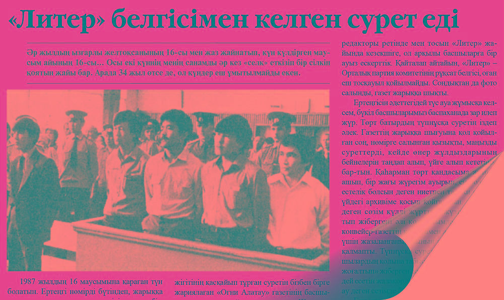 مەنىڭ وعان قوساتىنىم دا سول وقيعاعا ۇقساس. مەن ول كەزدە قاراعاندى وبلىستىق «ورتالىق قازاقستان» گازەتىنىڭ ءبولىم مەڭگەرۋشىسى ەدىم. وبلىستىق گازەتتىڭ كىتاپحاناسى بارلىق وبلىستىق گازەتتەردى جازدىرىپ الاتىن. كىتاپحاناعا كەلىپ جاتقان گازەتتەر ءۇيىلىپ جاتادى. ءبىر كۇنى كىتاپحاناعا بارىپ, «جەتىسۋ» گازەتىن قاراسام, قايرات باستاعان ءتورت جىگىتتىڭ سۋرەتى شىعىپتى. جىگىتتەر قاسقايىپ تۇر. سۋرەتكە تاڭعالىپ, بولمەلەردى ارالاتىپ ءجۇرىپ, ارىپتەستەرىمە كورسەتىپ شىقتىم دا, گازەتتى كىتاپحاناعا اپارىپ قويدىم. ەرتەڭىندە كگب-دان كەلىپ جۇرەتىن جىگىت (سىرتىنان تانيمىز) كىتاپحاناعا كەلىپ كەتىپتى. سودان كەيىن رەداكتورىمىز تىلەۋحان ءجۇسىپوۆ كىتاپحاناشىنى شاقىرتىپ, «جەتىسۋ» گازەتىنىڭ سول ءنومىرىن سۇراتادى. گازەت ورنىندا جوق بولىپ شىعادى. مەن «كورگەنىمدى, باسقالارعا كورسەتكەنىمدى ايتتىم, ورنىنا اپارىپ قويدىم», دەدىم.