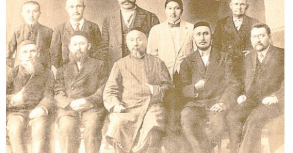 oرتادا ورىندىقتا وتىرعان: تاقيالى – مىرجاقىپ دۋلات ۇلى, سول جاق جانىنداعى – احمەت بايتۇرسىنوۆ, ودان بەرگى – رايىمجان مارسەكوۆ. وڭ جاقتا جەردە جەكە وتىرعان – ءانشى اسەت نايمانباەۆ. شاۋەشەك قالاسى, 1918 جىل.