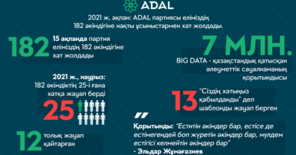 ءبىر اي ىشىندە تەك 25 اكىمدىك قانا جاۋاپ جازسا, ونىڭ تەك 12-ءسى عانا حاتقا تولىققاندى جاۋاپ قايتارعان. ياعني, اكىمدىكتەر كوپ جاعدايدا ء«سىزدىڭ حاتىڭىز قابىلداندى» دەگەن شابلوندىق جاۋاپ جازادى نەمەسە بيۋدجەتتىك باعدارلامادان ءۇزىندى بەرەدى.