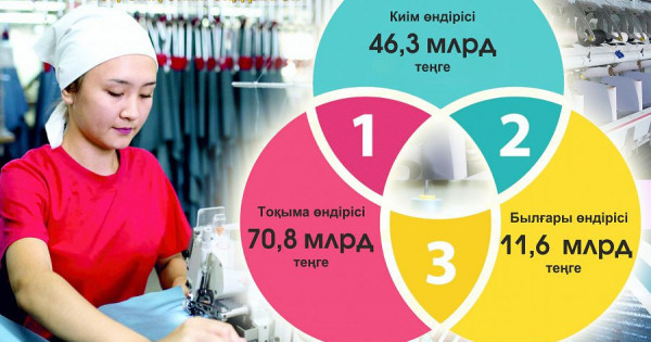 جەڭىل ونەركاسىپتەگى نەگىزگى ۇلەس توقىما وندىرىسىنە تيەسىلى – 70,8 ملرد تەڭگە. ودان كەيىنگى ورىندا كيىم ءوندىرىسى تۇر – 46,3 ملرد تەڭگە. بىلعارى ءوندىرىسىنىڭ كولەمى – 11,6 ملرد تەڭگە.