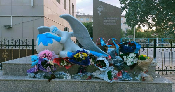 سىر وڭىرىندە كوروناۆيرۋسپەن كۇرەسكە جۇمىلعان ماماندار اراسىنان 19 مەديتسينا قىزمەتكەرى قايتىس بولدى. شاراعا ولاردىڭ تۋىستارى قاتىسىپ, ەسكەرتكىشكە گۇل شوقتارىن قويدى.